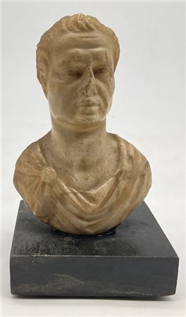 Antico busto virile togato in marmo scolpito su base in marmo nero (h cm 17,5) (difetti)