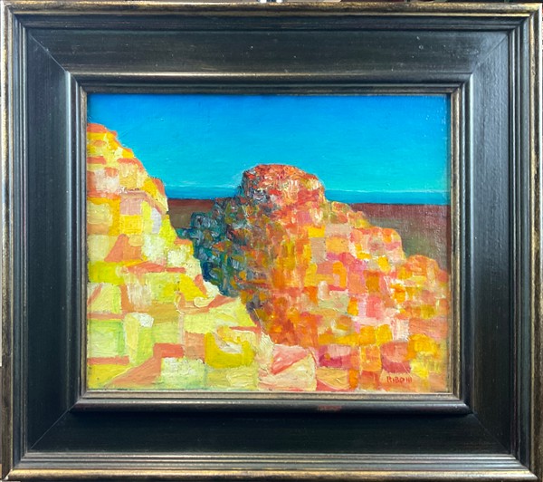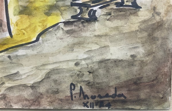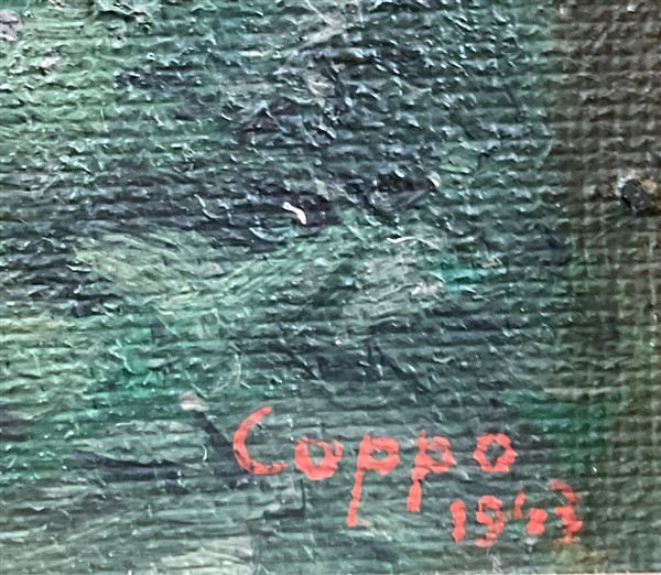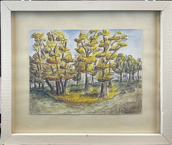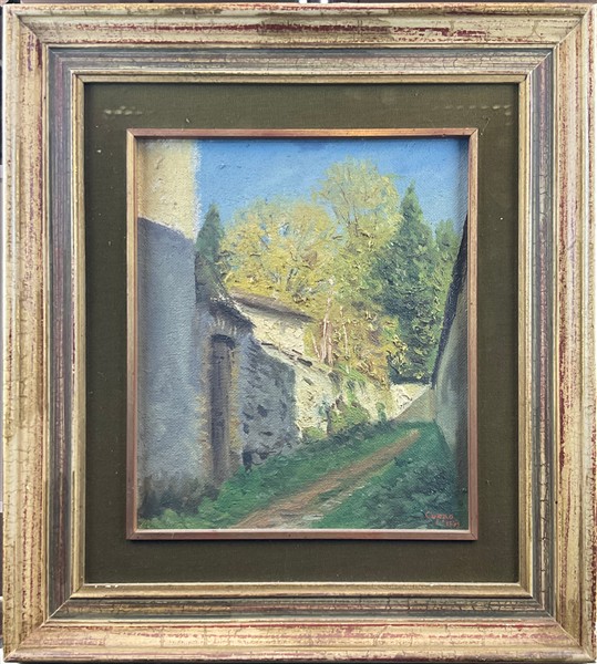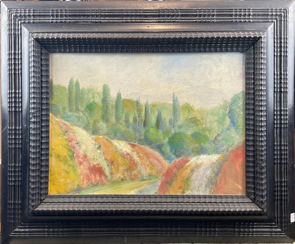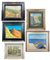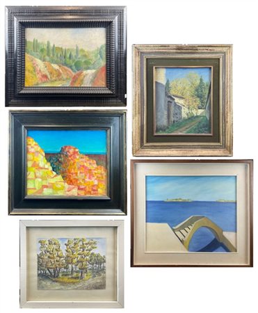 Lotto composto da quattro dipinti ad olio ed un disegno raffiguranti "Paesaggi", di diversi autori del secolo XX, supporti e misure (difetti)