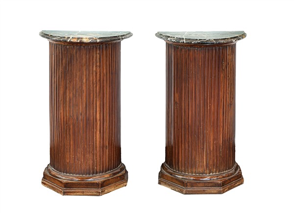 Coppia di piedistalli da parete a semicolonna scanalata e base gradinata, piani
