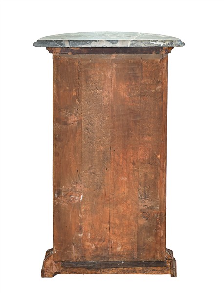 Coppia di piedistalli da parete a semicolonna scanalata e base gradinata, piani in marmo grigio a mezzaluna (cm 46x76x23) (difetti)