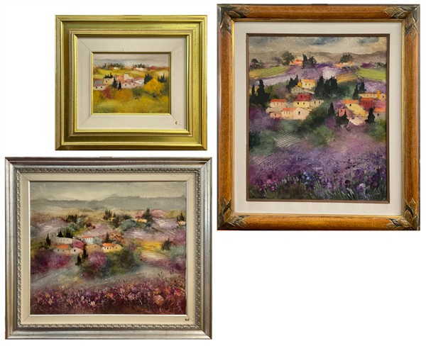 Lotto composto da tre oli su tela raffiguranti paesaggi con case di misure diverse (misura max cm 60x70) firmati al fronte e al retro