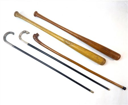 Lotto composto da tre diversi bastoni da passeggio di cui due con impugnatura rivestita in argento e una intagliata a testa di cane uniti a due mazze da baseball in legno. (l max cm 90) (difetti)