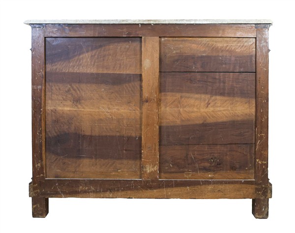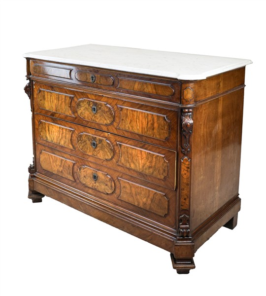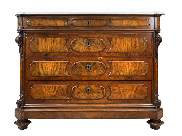 Cassettone in noce e radica con fronte a quattro diversi cassetti e montanti decorati da piccoli intagli, piano sagomato in marmo bianco. Fine secolo XIX (cm 122x96x66) (difetti)