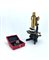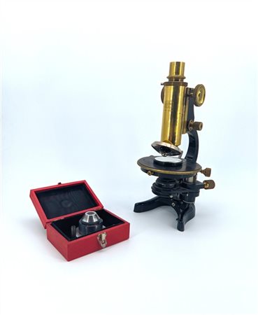 Microscopio marcato S.A.F. Koristka Milano, corredato da varie ottiche e da una