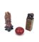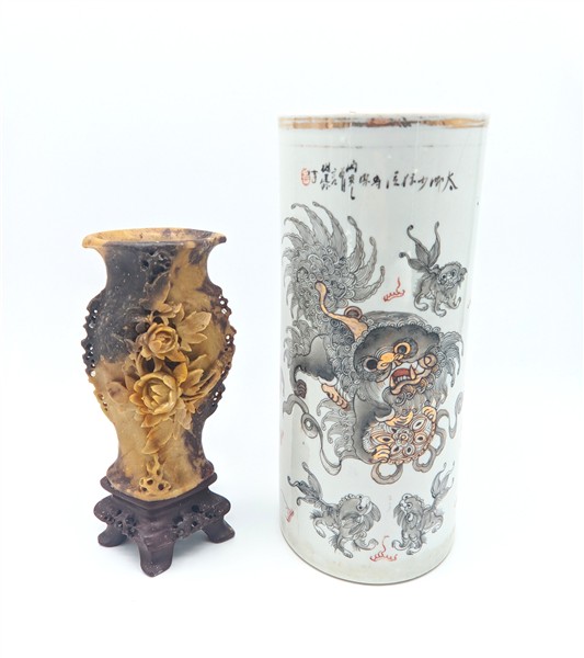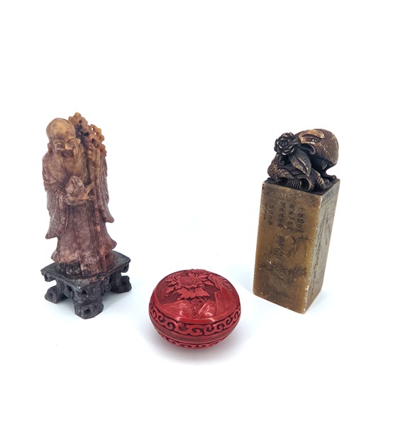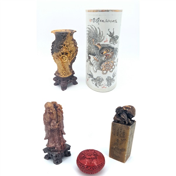 Manifatture orientali. Lotto composto da un vaso cilindrico in porcellana, un vaso, un sigillo, una figuretta in pietra saponaria e una scatolina in lacca rossa (h max cm 28) (difetti)