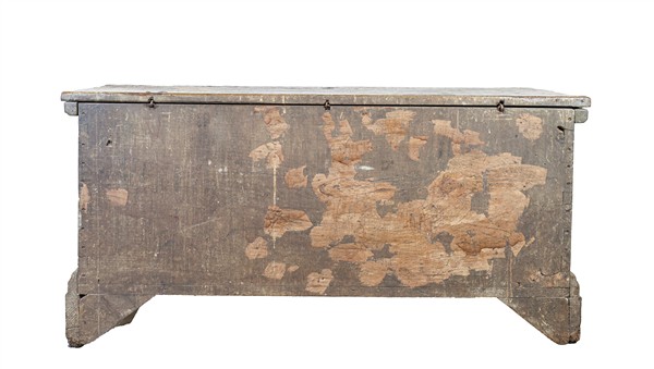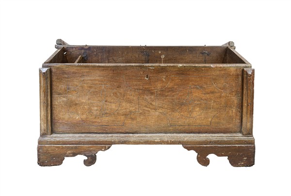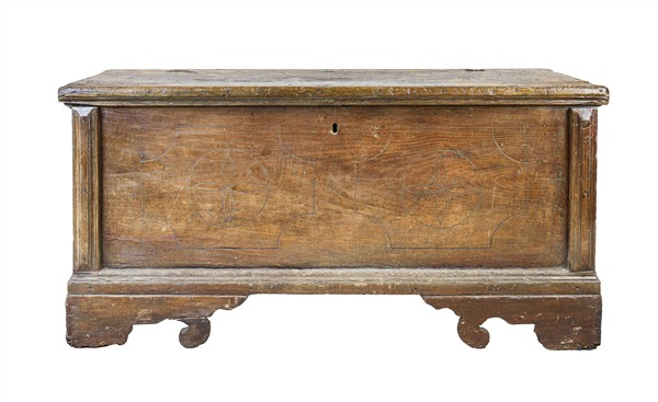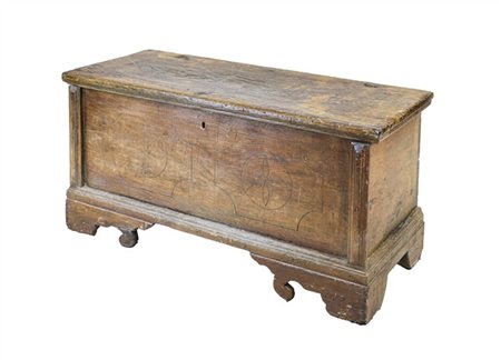 Cassapanca con fronte inciso a motivi stilizzati e piedi a mensola. Fine secolo XVIII (cm 134x66x54) (difetti)