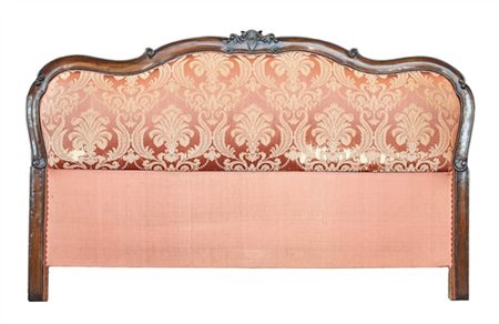 Testiera da letto in noce con cornice sagomata e scanalata, riserva imbottita e rivestita in tessuto operato (cm 183x114) (difetti)