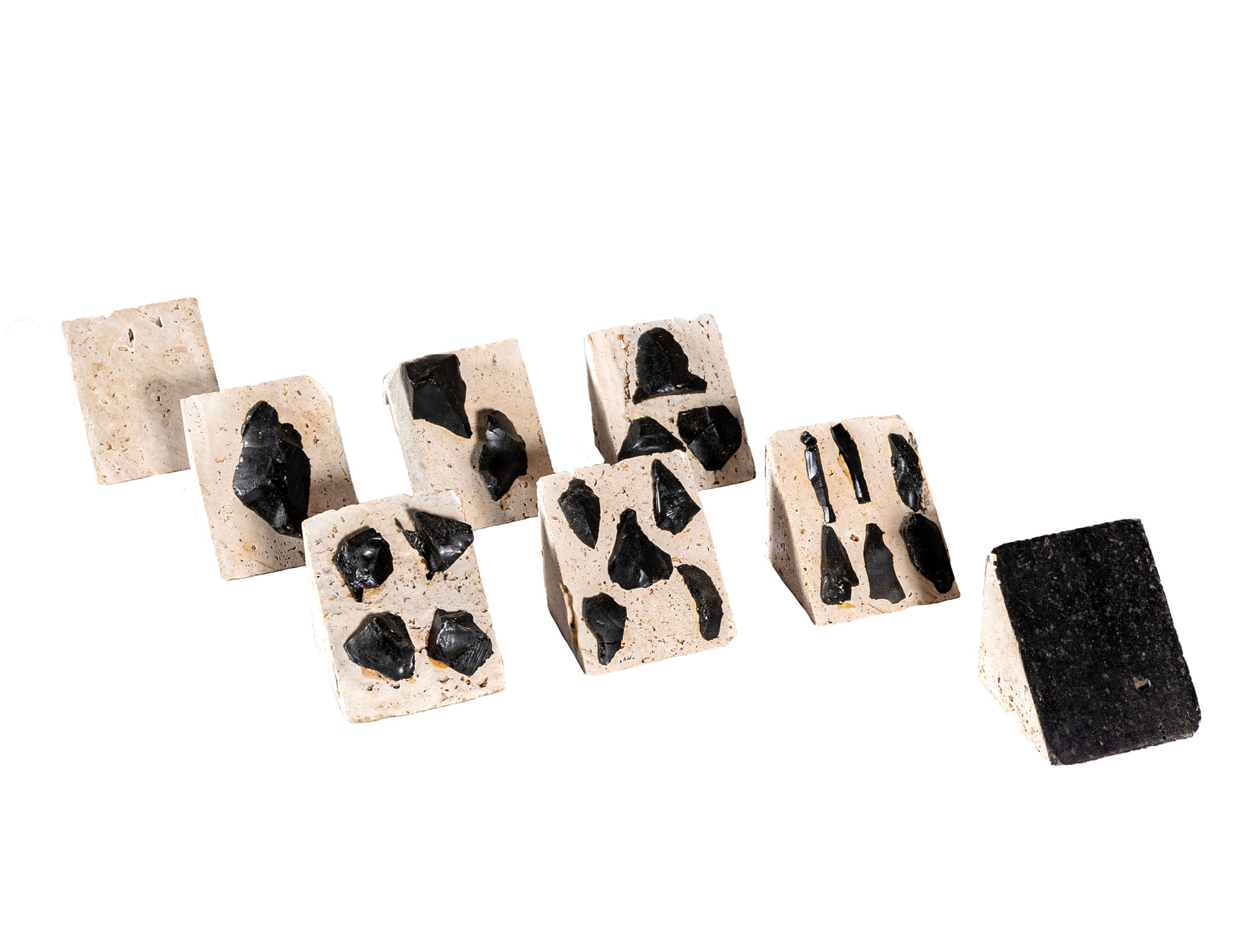 MIRELLA BENTIVOGLIO(1922 - 2017)Creazione e fine (I giorni della creazione)1982Scultura in travertino e catrame composta da otto elementiDimensioni variabiliOgni elemento misura 9,4 x 10 x 9 cmOpera accompagnata da tre autentiche su fotografia firmate dall'artistaPROVENIENZA:Collezione privata, Brescia