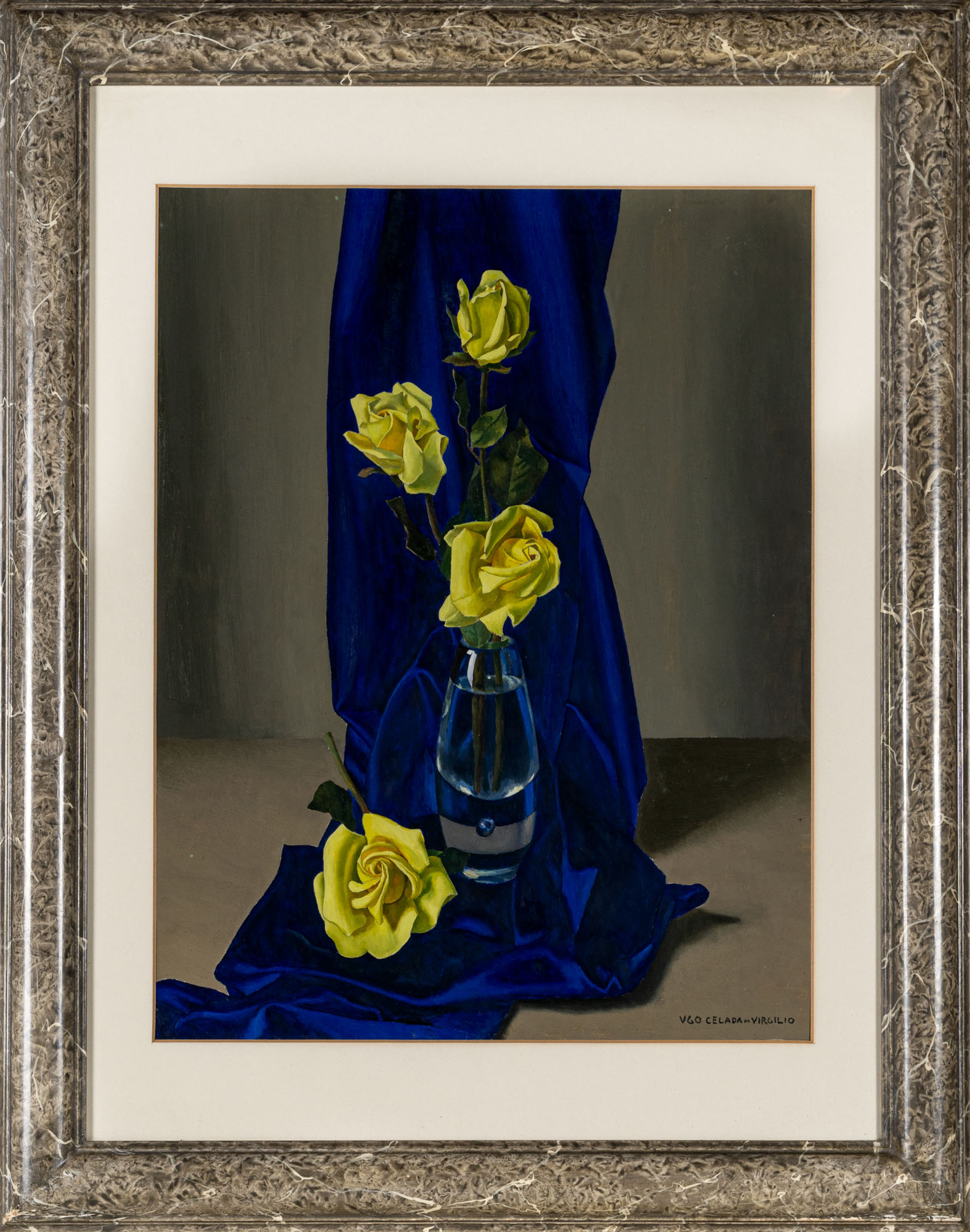 UGO CELADA DA VIRGILIO(Virgilio, 1895 - 1995)Composizione con vaso e rose gialleOlio su masonite65 x 50 cmFirmato in basso a destraPROVENIENZA:Collezione privata, Massa