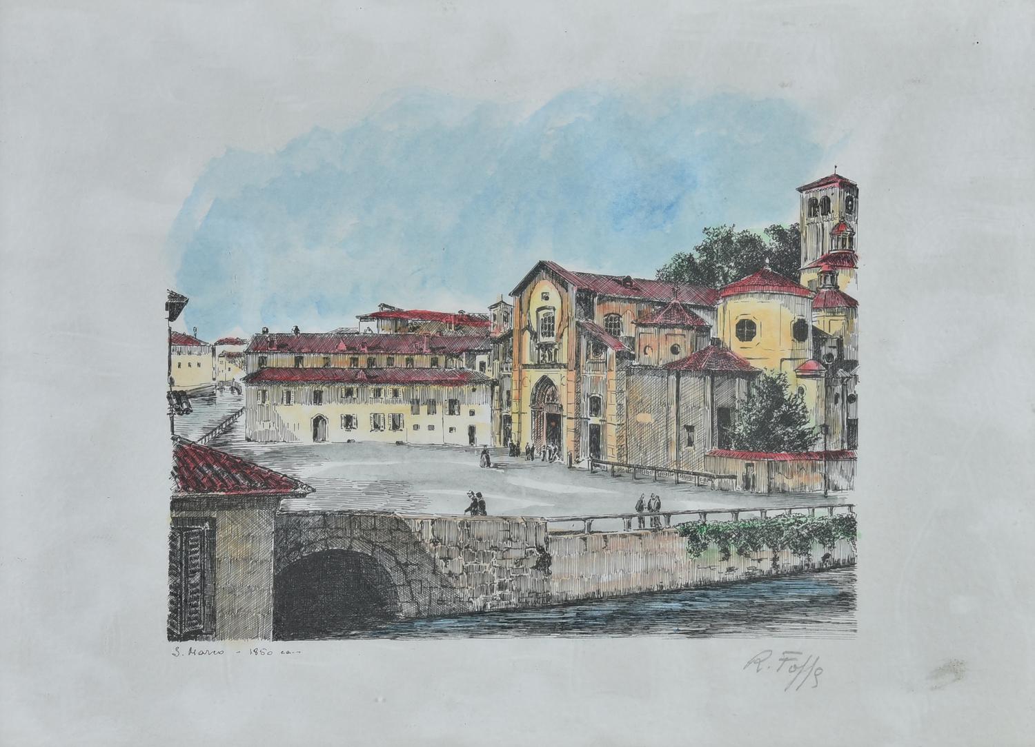 Ignoto S. MARCO stampa acquarellata a mano, cm 27x38 firma e titolo