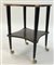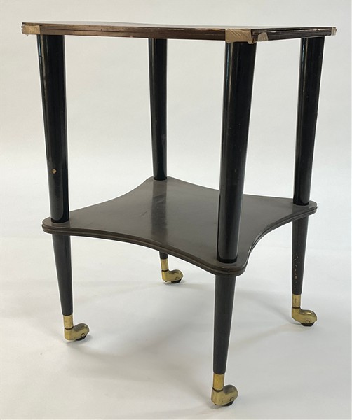 Carrello a due ripiani in legno tinto scuro, piedi muniti di rotelle. Italia, anni '50. (cm 55x82x55) (gravi difetti)
