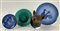 Lotto composto da una testa di volpe in terracotta dipinta e occhi in pasta vitrea (cm 17x14x13,5), e tre diversi piatti decorativi in ceramica smaltata in bianco, blu e verde raffiguranti volpi (d max cm 26). Secolo XX. (lievi difetti)