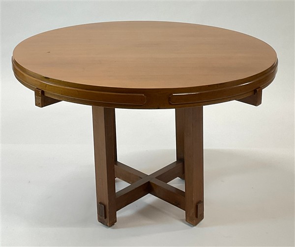 Tavolo con piano circolare in legno massello impiallacciato con gambe riunite d