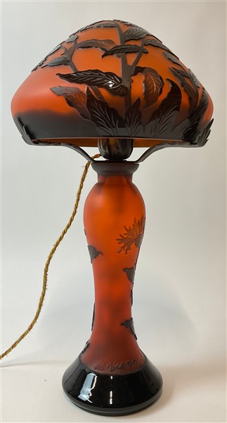 Lampada di gusto déco in vetro decorato all'acido color arancione e ametista scuro. Firmata alla base "de Vianne". Francia, secolo XX. (h cm 51) (lievi difetti)