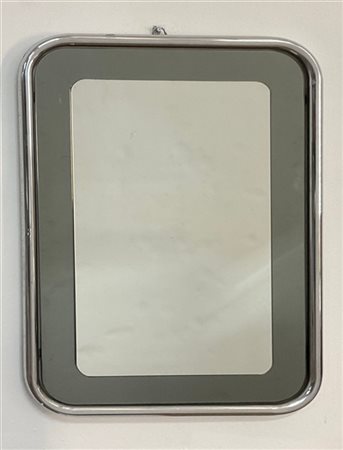 * Specchiera rettangolare con cornice in vetro specchiato fumé e tubolare metallico cromato. Italia, anni '70. (cm 59x90,5)