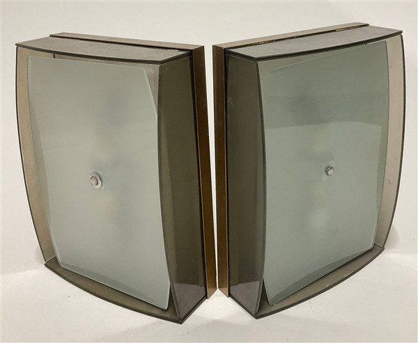 Coppia di lampade a plafone/parete. Italia, anni '60. Struttura in legno e alluminio ottonato, diffusori in cristallo fumé e vetro acidato sulla superficie interna. (cm 35,5x26,5x10,5) (difetti)