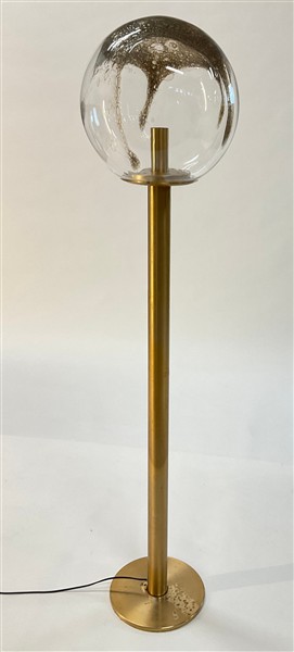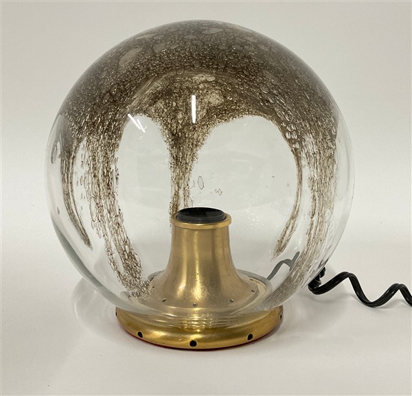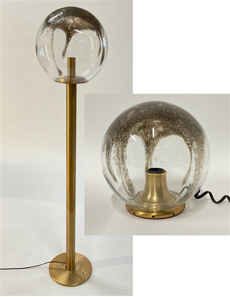 * Una lampada da terra e una da tavolo. Anni '60/'70. Diffusore in vetro soffiato cristallo con inclusione di bolle fumé, struttura in metallo ottonato. (h cm 163 e 24) (difetti)