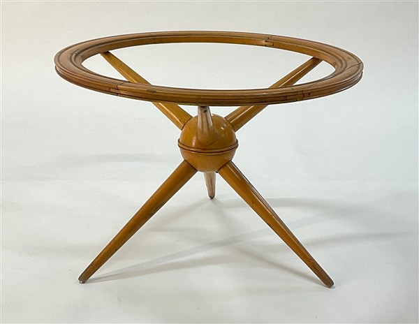 * Tavolino con struttura tripode retta da sfera. Italia, anni '50. (h cm 46; d cm 63) (difetti, restauri e mancanze)