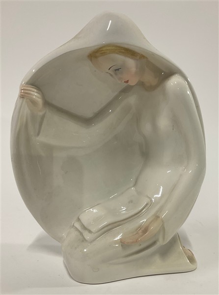 Madonna inginocchiata. Torino, anni '30. Ceramica formata a colaggio, smaltata bianca e rosa sotto vetrina. Firmato sotto la base con simbolo grafico della manifattura. (h cm 22) (lievi difetti)
