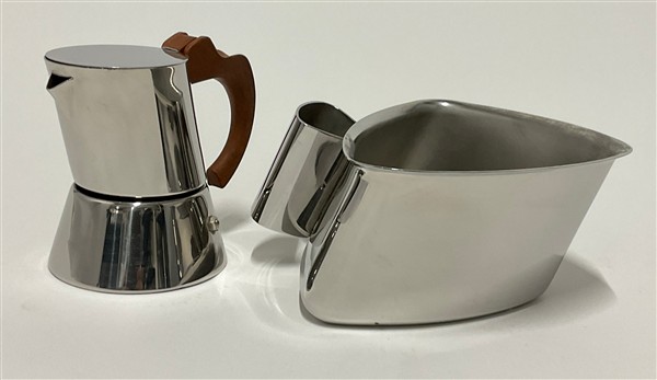Lotto composto da una caffettiera in acciaio con manico in materiale plastico a imitazione del legno e un versatoio triangolare in acciaio. Produzione MEPRA, anni '90. (h max cm 14,5) (lievi difetti)