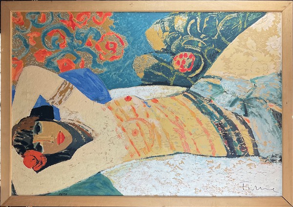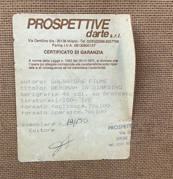Salvatore Fiume "Deborah in giardino" serigrafia su broccato applicata su mason