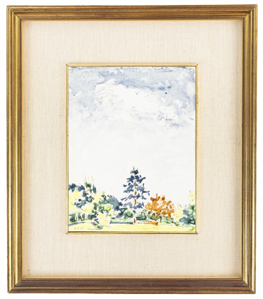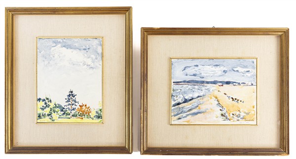 Due tecniche miste su carta raffiguranti marina e paesaggio con alberi