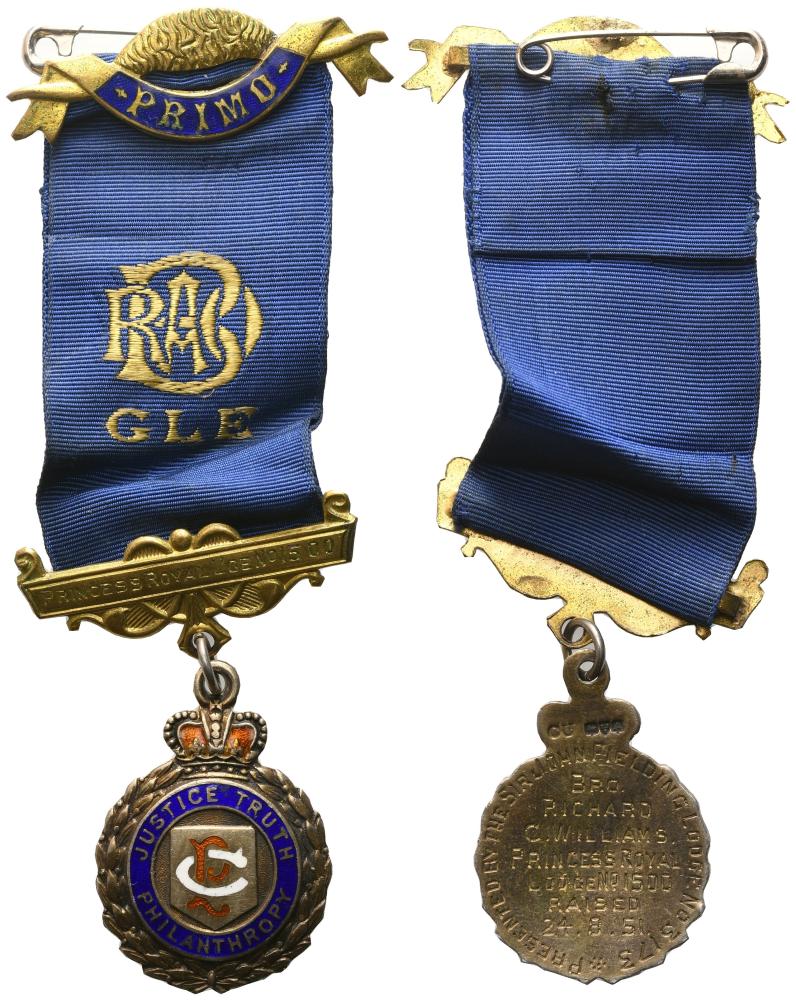 Medaglia "Justice truth Philanthropy", Primo, G L E, Princess Royal L'ge N° 1500, 1951, AG E Smalti (27,4 x 121 mm)