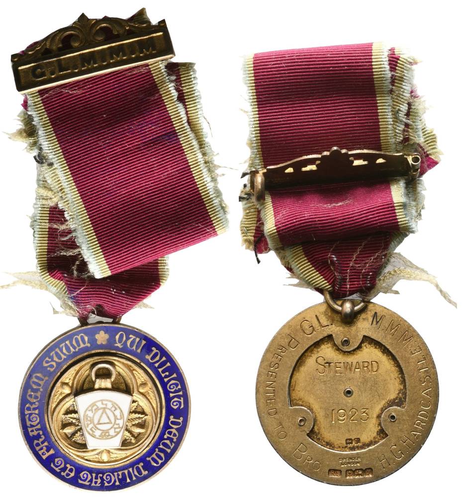 G. L. M. M. M. - Presented To Bro H. G. Hardcastle - Steward 1923.    Peso: 29,30 g.