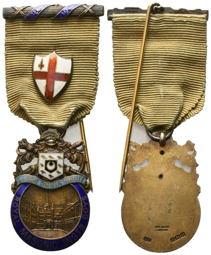 Medaglia Royal Masonic Inst_n Boys, "Labor Omnia Vincit", Steward 1914, AG E Smalti (27,3 x 83 mm)