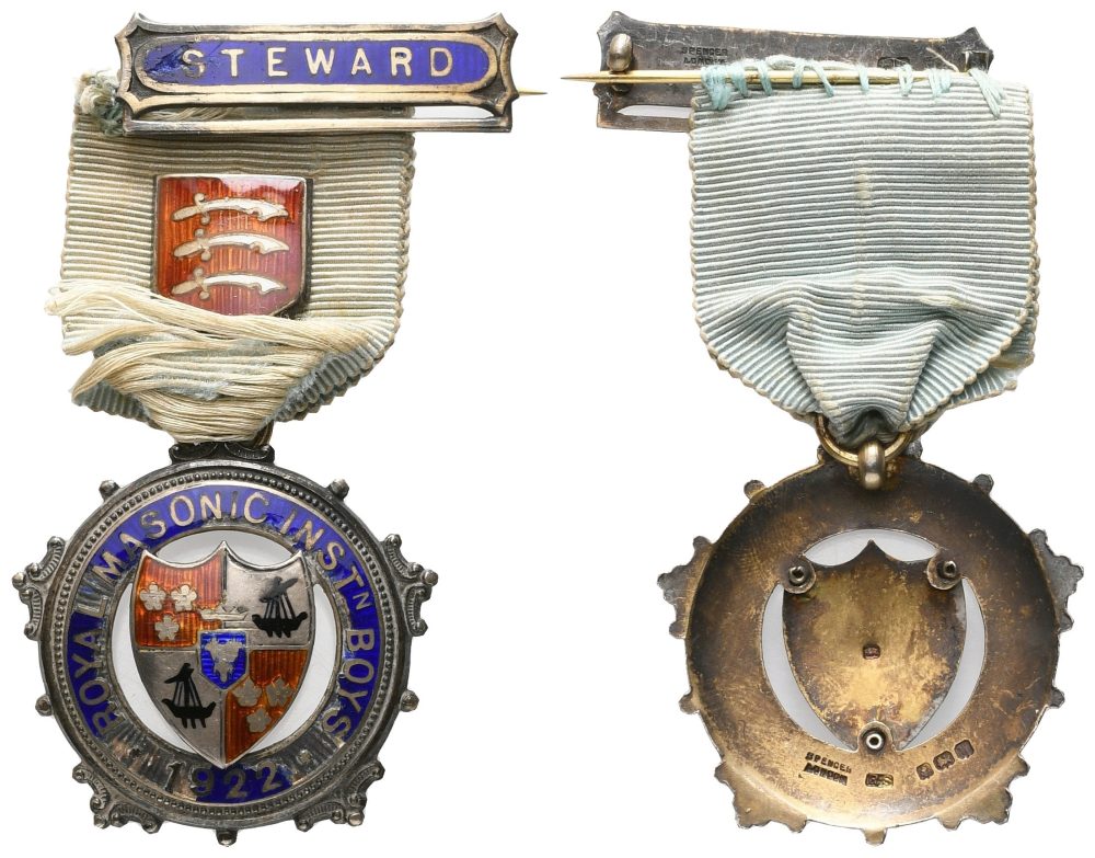 Medaglia Royal Masonic Inst.n Boys 1922, Steward, AG E Smalti (39 x 77 mm)