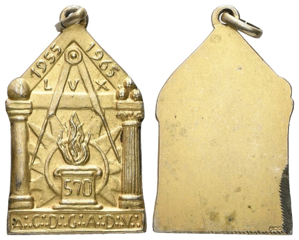 Medaglia In Metallo Dorato A. C. D. G. A. D. V. "1955 - 1965" Con Simboli Massonici (23 x 40 mm)