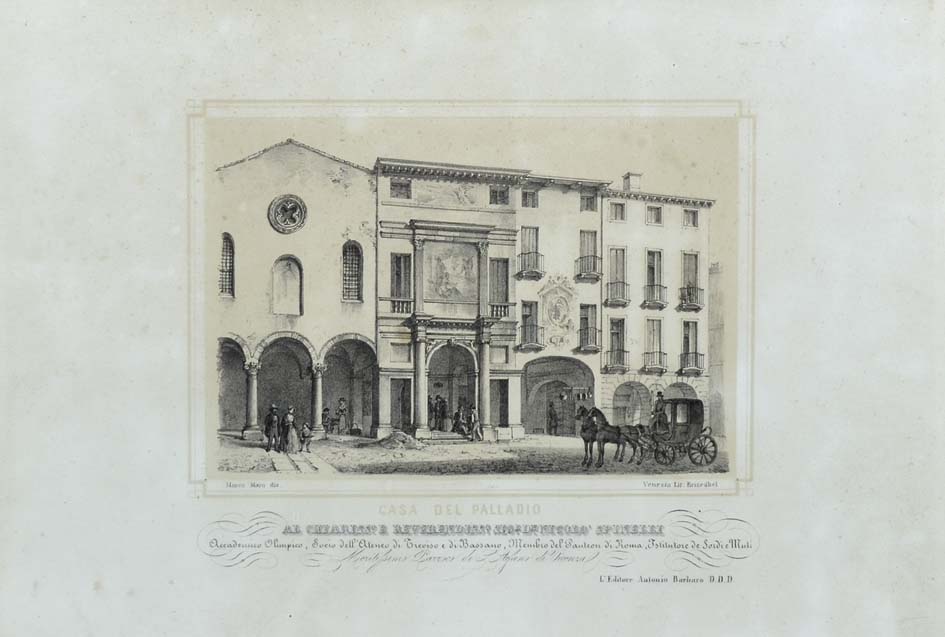 MORO MARCO Zenson di Piave (Tv) 1817 - 1885 Casa del Palladio stampa 35x52 "Album di gemme architettoniche ossia gli edifici più rimarchevoli di Vicenza e del suo territorio rilevati da Giuseppe Zanetti, disegnati da Marco Moro" inciso da G. Brizeghel Venezia tav. 1416 fascicolo XXVII Antonio Barbaro editore 1847
