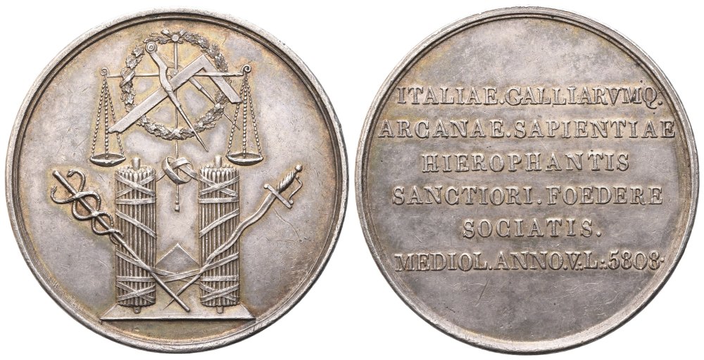 Medaglia (di cui non si conosce l’autore) coniata in occasione di una importante cerimonia per testimoniare gli stretti legami tra la Massoneria francese ed italiana. Dritto: al centro, poggiati su un triangolo, due fasci littori ritti, affiancati e legati da un unico nastro; davanti ad essi, inclinati, un caduceo a sinistra e una spada fiammeggiante a destra; in alto, avvolti da una ghirlanda, un compasso, una squadra e una bilancia. Rovescio: una legenda in latino su sei linee: ITALIAE. GALLIARVMQ. ARCANAE. SAPIENTIAE HIEROPHANTIS SANCTIORI FOEDERE SOCIATIS. MEDIOL. ANNO. V L 5808. la cui traduzione è: “Agli iniziati del saper segreto d’Italia e di Francia associati in virtù di un patto sacro in Milano l’anno della vera luce 5808” (Secondo il calendario massonico il 5808 corrisponde al 1808 del calendario gregoriano). Di tali medaglie ne furono coniate almeno due d’oro ed un certo numero d’argento e di bronzo. Bramsen 833 Marvin L (50). Peso: 21,15 g.