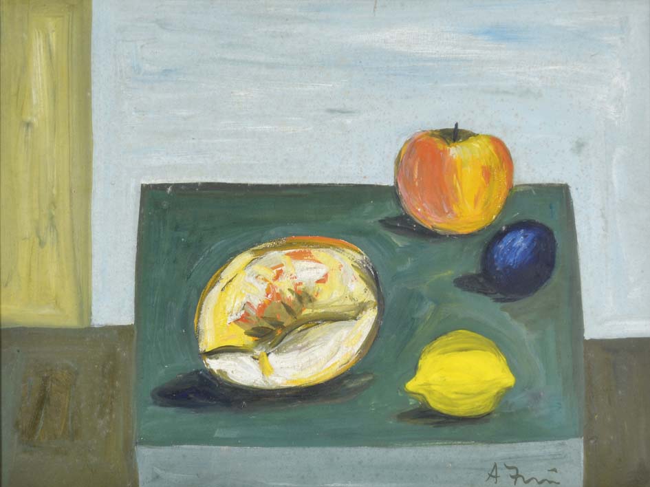 FUNI ACHILLE Ferrara 1890 - Appiano Gentile 1972 Natura morta (anni '60) olio su masonite 36x48 firma in basso a destra di Raffaele de Grada su foto, conferma di autenticità a cura dell'Archivio Achille Funi a cura dello Studio d'Arte Nicoletta Colombo Galleria Borgonuovo Milano - etichetta al retro