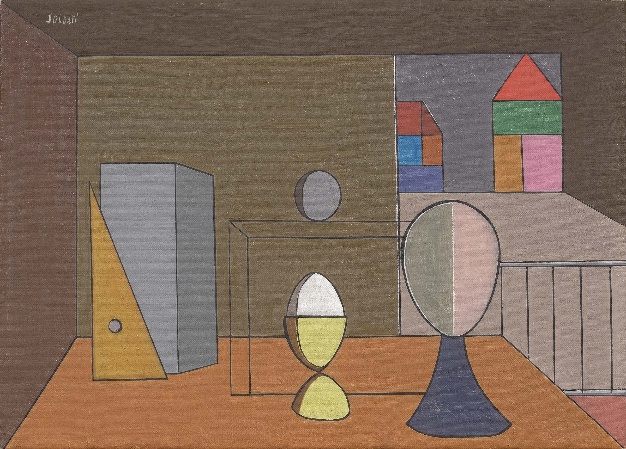 Atanasio Soldati Parma 1896 - 1953 Finestra a Losana, 1943 Olio su tela, cm. 33x45,8 Firma in alto a sinistra: Soldati; al verso su una tela di rivestimento: etichetta Galleria Civica d’Arte Moderna, Torino: etichetta Sovrintendenza alle Gallerie Roma II /Arte Contemporanea / Galleria Nazionale d’Arte Moderna / Mostra Cento Opere d’Arte Italiana dal Futurismo a oggi / 20 dicembre 1968 - 20 gennaio 1969: etichetta Mostra Retrospettiva di Atanasio Soldati / Centro Culturale Olivetti / Ivrea Giugno 1965 / cat. n. 26: etichetta Lorenzelli Arte Milano: etichetta Adelphi Galleria d’Arte Contemporanea, Padova. Esposizioni: Cento Opere d’Arte Italiana dal Futurismo ad oggi, Roma, Galleria Nazionale d’Arte Moderna, 20 dicembre 1968 - 20 gennaio 1969, cat. p. 114, 115, n. 48, illustrato; Atanasio Soldati, Torino, Galleria Civica d’Arte Moderna, 6 novembre 1969 - 6 gennaio 1970, cat. n. 88, illustrato.