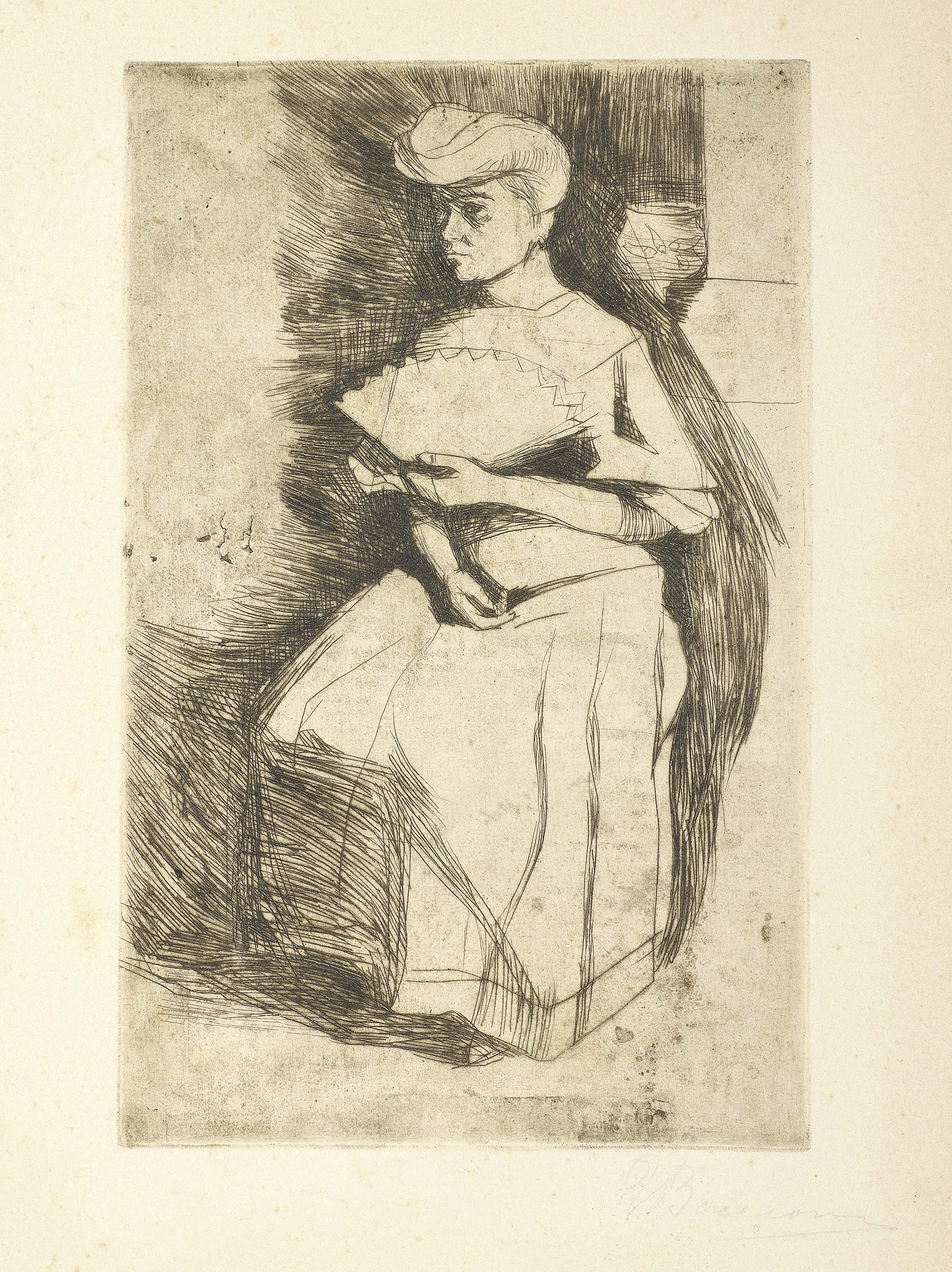 Umberto Boccioni Reggio Calabria 1882 - Sorte (Vr) 1916 Signora con ventaglio, 1907 Puntasecca, cm. 23,5x15 Firma a matita in basso a destra: U. Boccioni. Storia Collezione privata,Trieste; Collezione privata Bibliografia Maria Drudi Gambillo, Teresa Fiori, Archivi del Futurismo, volume secondo, De Luca Editore, Roma, 1962, p. 274, n. 422; Teresa Fiori, Archivi del Divisionismo, volume secondo, saggio introduttivo di F. Bellonzi, Officina Edizioni, Roma, 1968, p. 184, n. 2241; Paolo Bellini, Catalogo completo dell’opera grafica di Umberto Boccioni, Salamon e Agustoni editori, Milano, 1972, p. 32, n. 8; Guido Ballo, Boccioni, la vita e l’opera, Il Saggiatore, Milano, (I ed. 1964), 1982, tav. 40; Maurizio Calvesi, Ester Coen, Boccioni. L’opera completa, Electa Editrice, Milano, 1983, p. 228, n. 285.