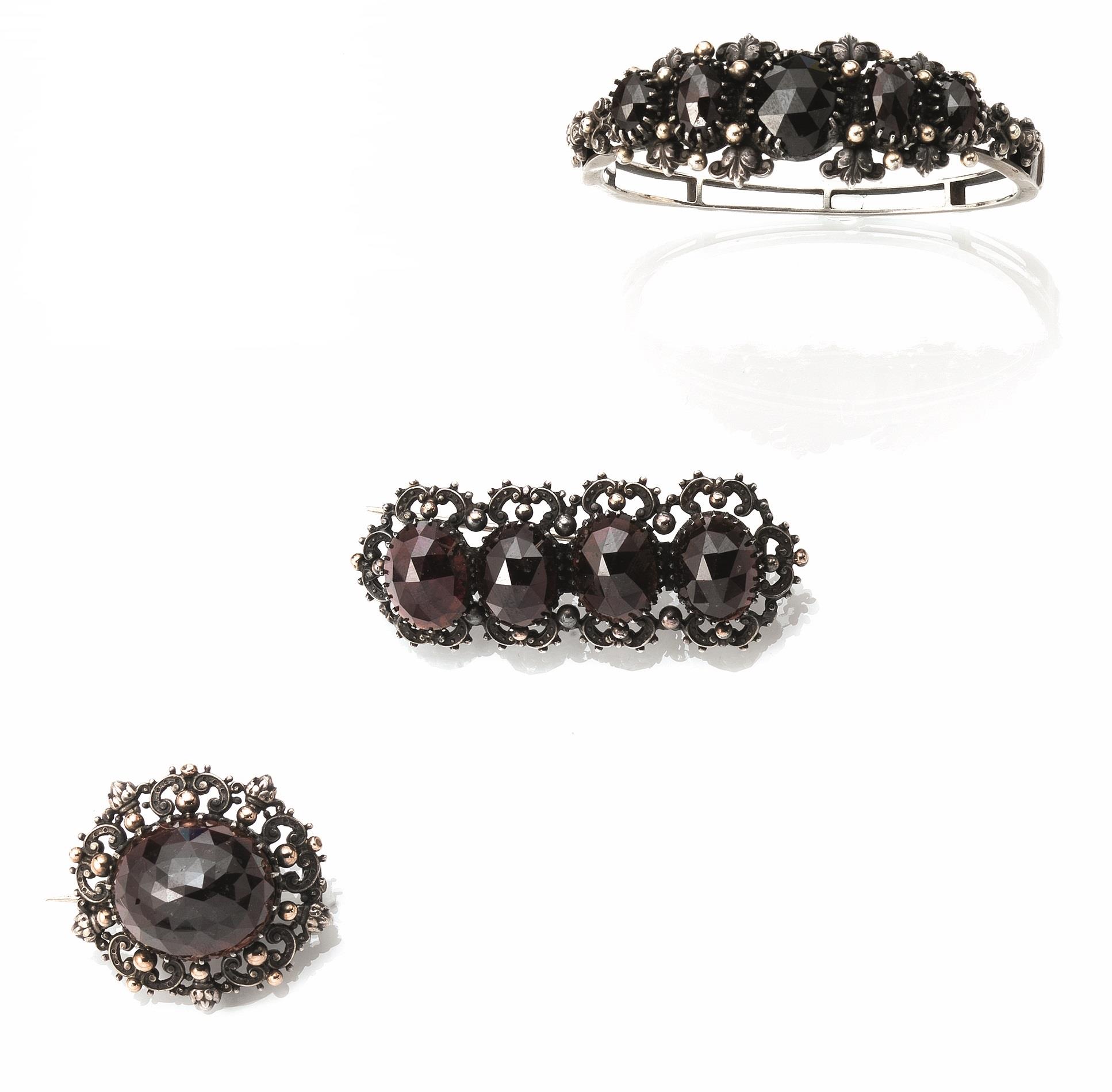 il bracciale realizzato a cerchio rigido decorato da volute in argento, nella la parte centrale cabochon sfaccettati di granati; le spille di forma rotonda e rettangolare en suite con il bracciale, g 70 complessivi