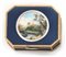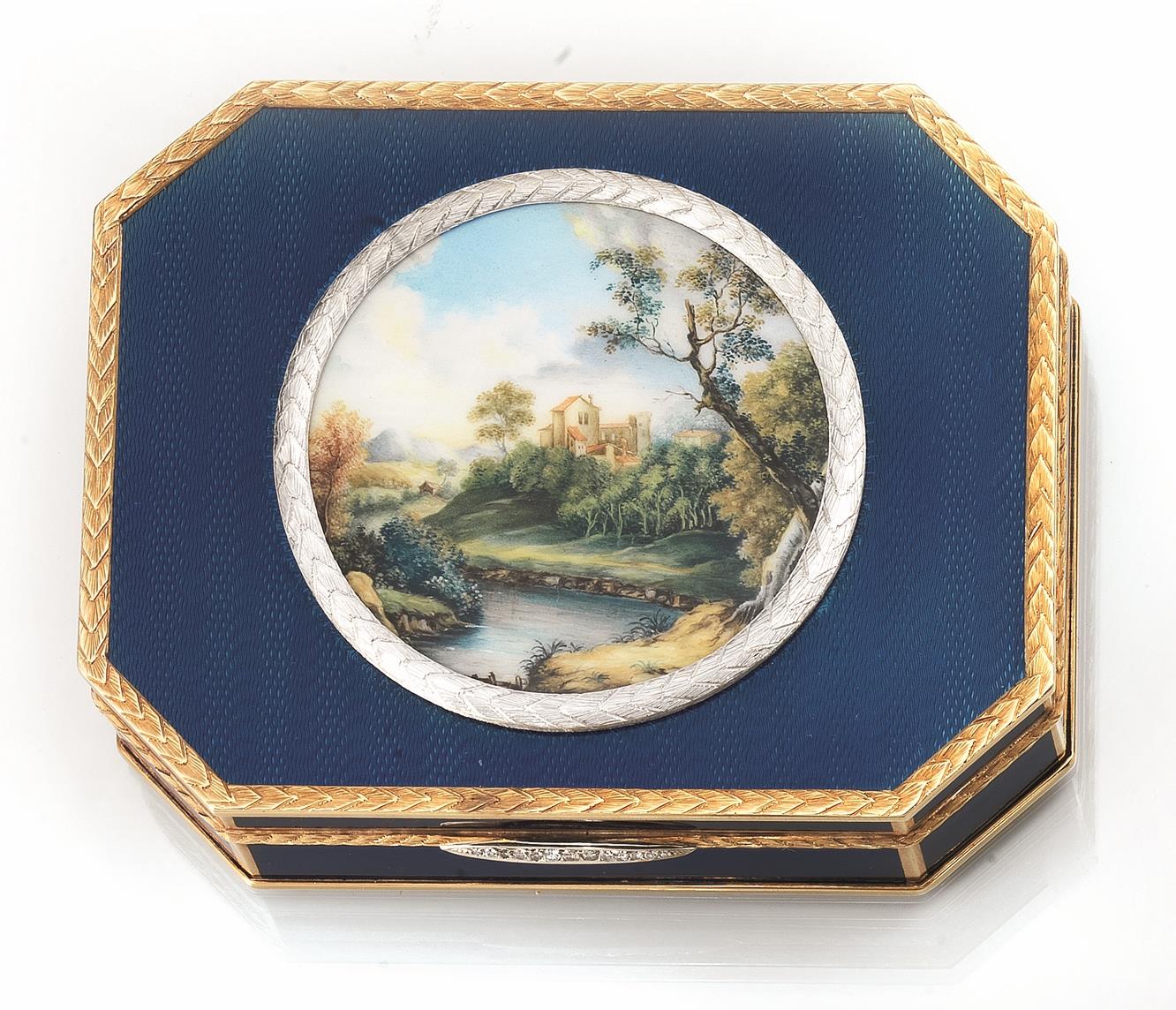 con profilo di forma ottagonale in oro giallo cesellato, al centro un elemento in smalti policromi raffigurante un paesaggio entro profilo in oro bianco cesellato. Apertura impreziosita da brillanti, punzoni Torrini e 750, g 257