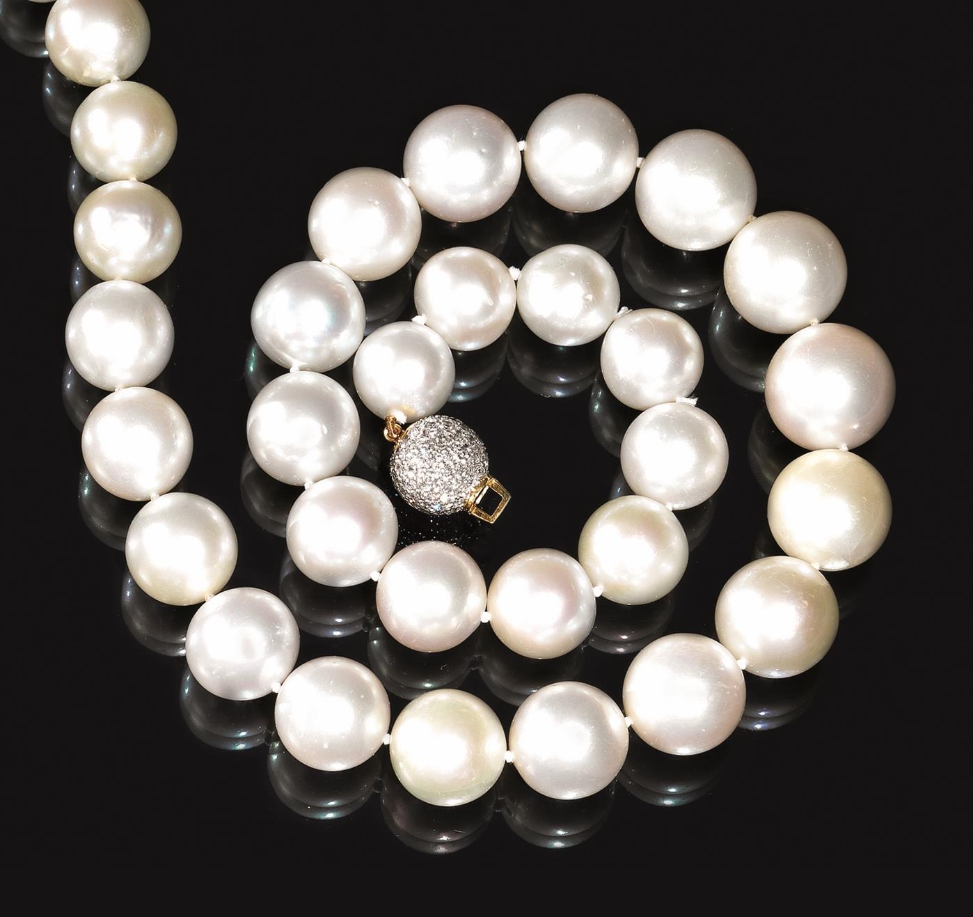 realizzata ad un filo di perle dei Mari del Sud di diam. da mm 13 a mm 16, fermatura a sfera interamente decorata da pave di brillanti, punzone 18 kt, g 129 alcune perle danneggiate