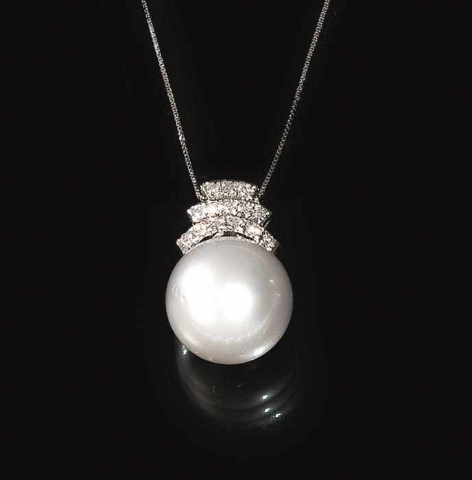 realizzato con una perla australiana diam. mm 16, impreziosita da un morivo digradante in oro bianco e brillanti, corredato di catenina, punzone 750, g 8