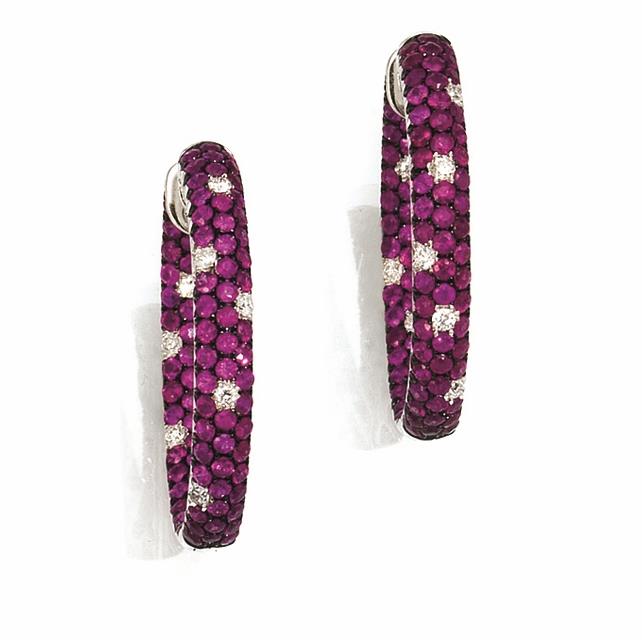 ciascuno disegnato come un cerchio ovale decorato nella parte anteriore ed in quella interna posteriore da un pavè in rubini per ct 6.30 punteggiato da brillanti per ct 0.50, punzone 750, g 11