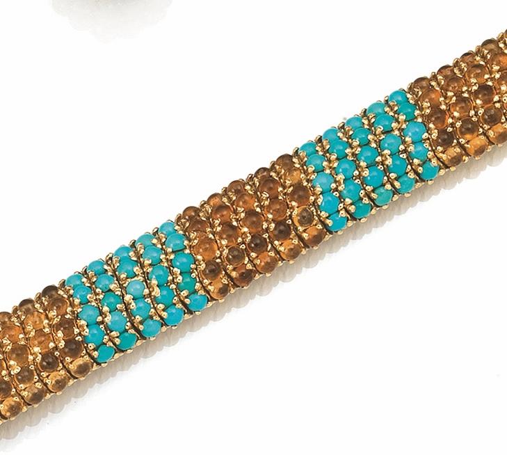 realizzato come un nastro bombato a maglia flessibile interamente decorato da fasce alternate in turchesi e citrini cabochon, punzoni a testa di cavallo e 750, g 75