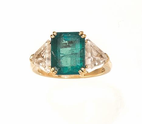 realizzato con smeraldo rettangolare affiancato da due diamanti triangolari, punzone 750, g 7