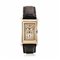 Cassa rettangolare svasata in oro e acciaio, fianchi bombati, fondello a scatto. Quadrante bi-tono argentè, nella parte superiore quadrante delle ore quadrato con numeri arabi e lancette a bastone, secondi nella parte inferiore. Movimento a carica manuale. Cinturino in pelle con fibbia a ardiglione in metallo non pertinente. Dim. mm 36x24
