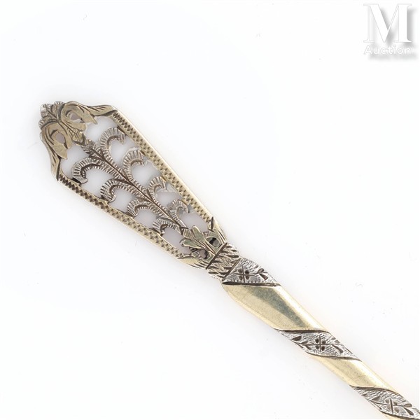 Argent et argent doré ciselés, décor en bichromie de végétation enrubannée terminée d'un motif ajouré de palmes dans un entourage de perles et feuillages.
