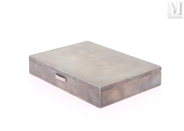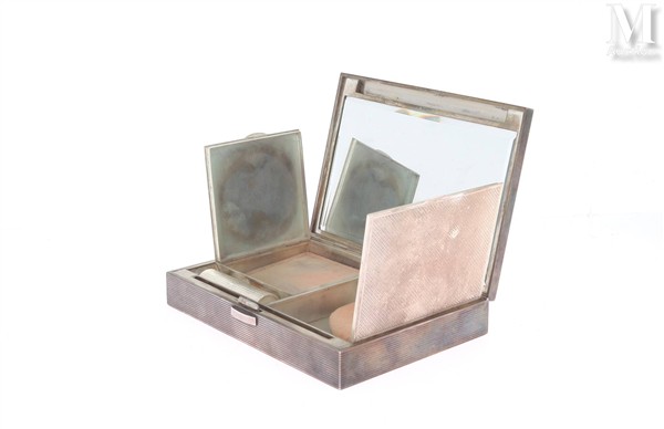 A décor ciselé de guillochis géométriques, ouvrant à un battant supérieur habillé d'un miroir et dévoilant trois compartiments dont deux couverts, et un étui à rouge à lèvres.