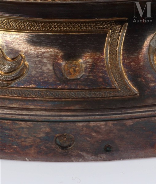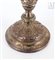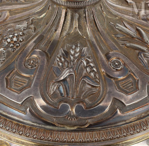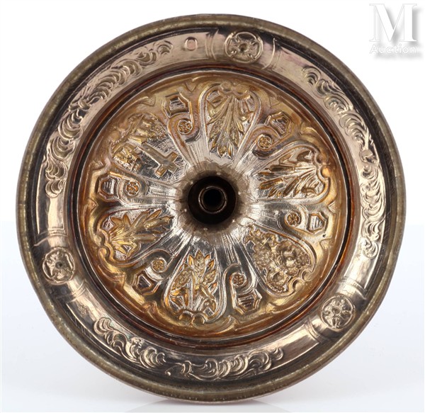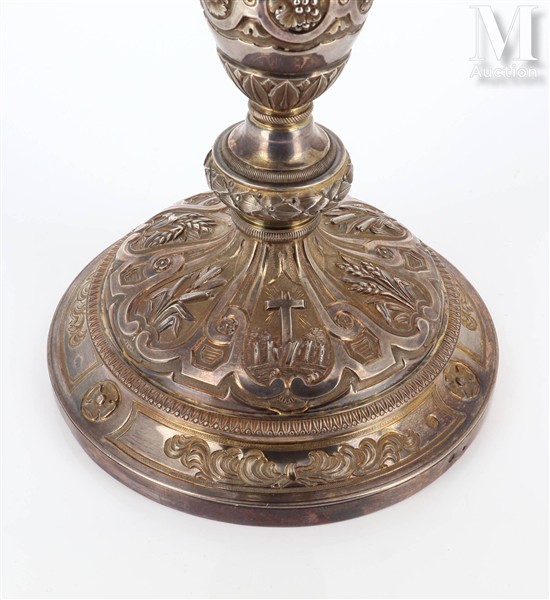 Le fût de forme balustre à décor repoussé et ciselé de frises de laurier, de frises de perles et de pampres de vignes. Le piédouche circulaire orné d'entrelacs dessinant 6 cartouches aux motifs de vigne, de blé et de roseau, symboles de prospérité et de force, et la croix.