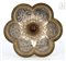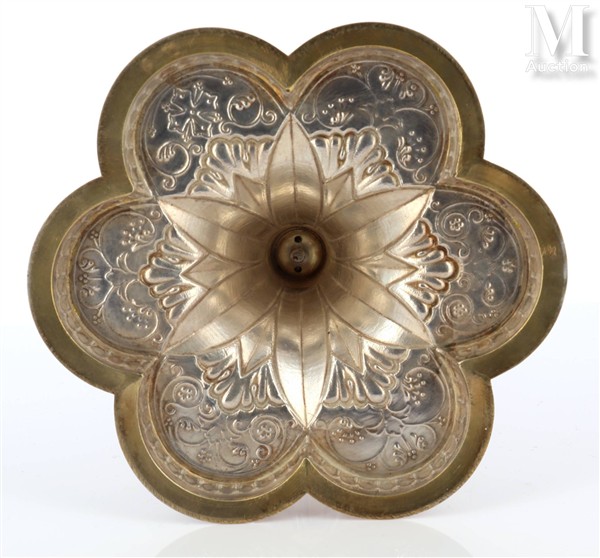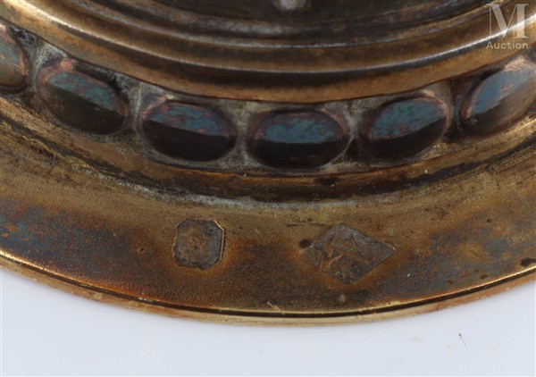 La ciotola decorata con foglie lanceolate concentriche, alternate di vermeil e argento, il fusto con decorazione a sbalzo e cesellato con fregio di fitti gadroons e fregi di fiori stilizzati, il piedistallo polilobato con intreccio vegetale cesellato a croce occitana.