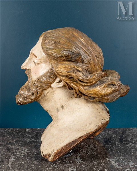 Tête de Christ Tête en bois sculpté peint polychrome représentant le Christ...