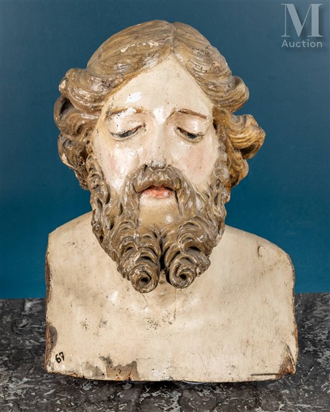 Lot 54 | Tête de Christ Tête en bois sculpté peint polychrome représentant le Christ...